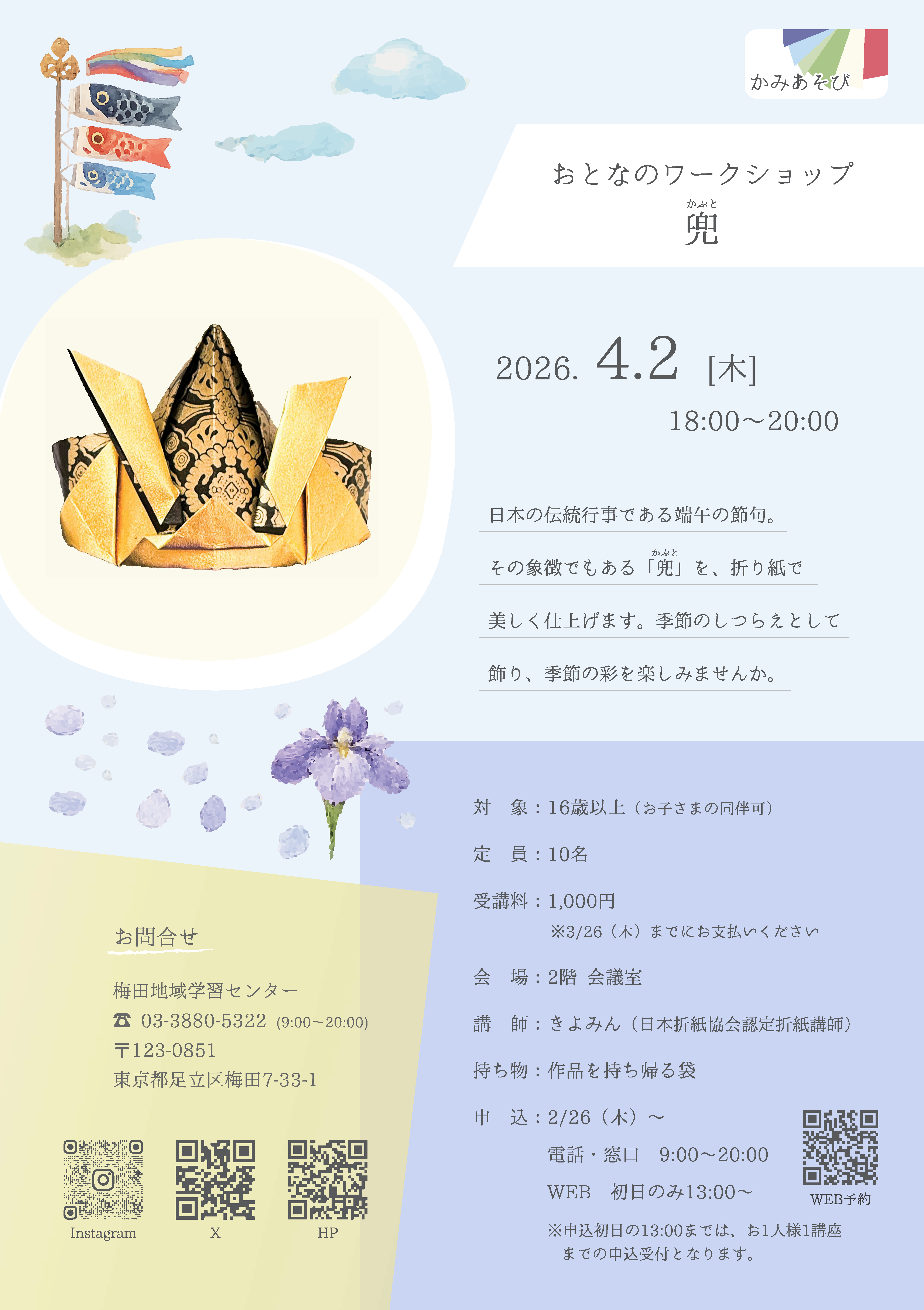 4月022026 かみあそび おとなのワークショップ 兜 日本の伝統行事である端午の節句。 その象徴でもある「兜」を、おりがみで美しく仕上げます。 季節のしつらえとして飾り、季節の彩を楽しみませんか。 日時4月2日(木)18:00~20:00 講師きよみん(日本折紙協会認定折紙講師) 会場2階会議室 対象16歳以上(お子さまの同伴可) 参加費1,000円 ※3/26(木)までにお支払いください。 定員10人 申込み方法2/26(木)~ 受付窓口・電話 9:00~20:00 インターネット 初日のみ13:00~ ※申込初日の13:00までは、お1人様1講座までの申込受付となります。