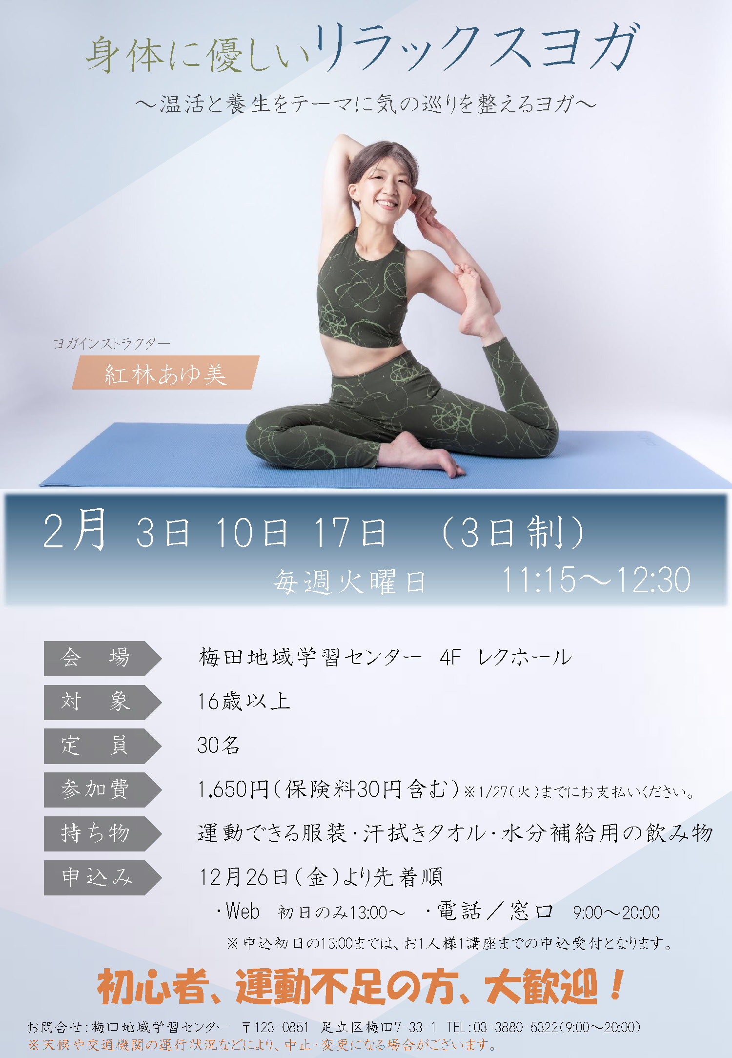 2月032026 身体に優しいリラックスヨガ(3日制) 自宅でもできる簡単なヨガポーズを学びます。 インターネット申し込みはこちら 日時2月3日、10日、17日(いずれも火曜日) 午前11時15分~12時30分 講師紅林あゆ美(ヨガインストラクター) 会場4F レクホール 対象16歳以上 参加費1,650円(保険料込) ※1/27(火)までにお支払いください。 定員30名 申込み方法12/26(金)~ インターネット・電話・窓口(先着順) 電話・窓口 9:00~20:00 インターネット 初日のみ13:00~ ※申込初日の13:00までは、お1人様1講座までの申込受付となります。 12月29日~1月3日は年末年始休館のため、窓口・電話での受付はできません。 また、12月28日および1月4日は窓口・電話は17時で終了となります。 持ち物運動できる服装、汗拭きタオル、飲み物(水分補給)