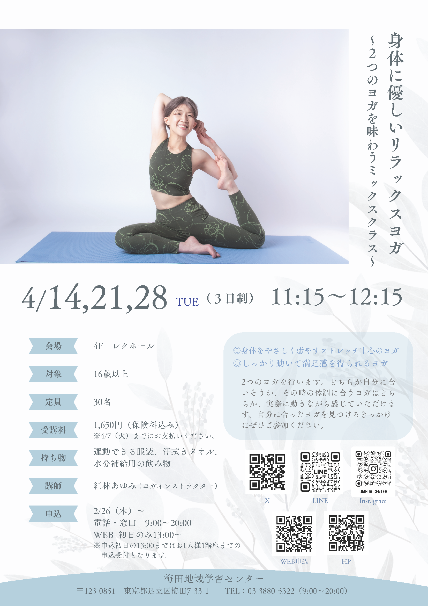 どちらが自分に合いそうか、その時の体調に合うヨガはどちらか、実際に動きながら感じていただけます。自分に合ったヨガを見つけるきっかけにぜひご参加ください。