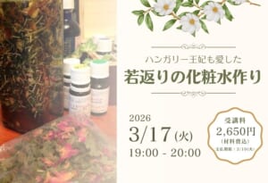 3月172026 ハンガリー王妃も愛した若返りの化粧水作り ハンガリー王妃エリザベートが若返ったエピソードでも有名な化粧水を作ります。 ローズマリーやローズなど、数種類のハーブの作用が美しいお肌づくりに働きかけます。 これから汗をかく季節にも、お肌を引き締めて清潔に保つ働きがあり、ボディローションとしても使えます。 完成品はなんと300mlとたっぷり! お使い頂ける状態になるまでに1ヶ月ほどかかるため、当日は講師が作成した完成品(10cc)をお渡しします。 日時3月17日(火) 午後7時~8時 講師外尾 幸恵(看護師・アロマライフスタイリスト®) 会場3階 第4学習室 対象16歳以上 参加費2,650円(材料費込) ※支払期限:3月10日(火) 定員15名 申込み方法1/26(月)からインターネット・電話・窓口にて受付(先着順) 受付窓口・電話 9:00~ インターネットは初日のみ13時~受付 ※講座受付初日は、13時まではお1人1講座までの申込受付となります。 持ち物ティッシュ、筆記用具