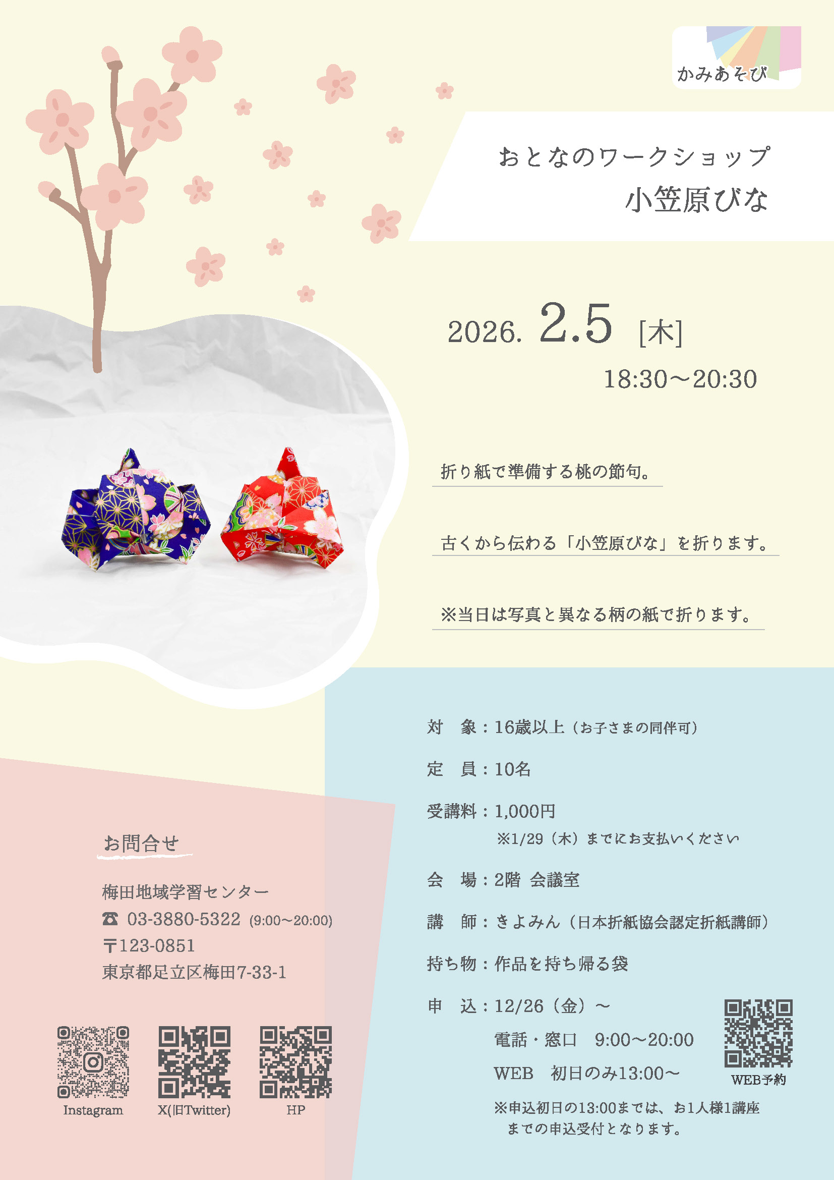2月052026 かみあそび おとなのワークショップ 小笠原びな 折り紙で準備する桃の節句。 古くから伝わる「小笠原びな」を折ります。 ※当日は写真と異なる柄の紙で折ります。 日時2月5日(木)18:30~20:30 講師きよみん(日本折紙協会認定折紙講師) 会場2階会議室 対象16歳以上(お子さまの同伴可) 参加費1,000円 ※1/29(木)までにお支払いください。 定員10人 申込み方法12月26日(金)~ 受付窓口・電話 9:00~20:00 インターネット 初日のみ13:00~ ※申込初日の13:00までは、お1人様1講座までの申込受付となります。 12月29日~1月3日は年末年始休館のため、窓口・電話での受付はできません。 また、12月28日および1月4日は窓口・電話は17時で終了となります。