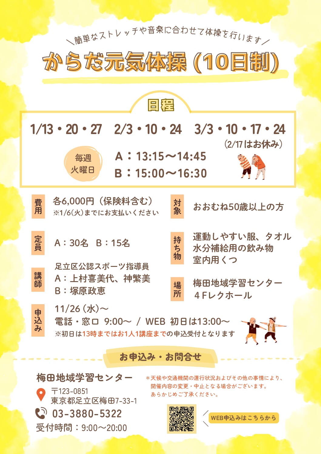 往復ハガキに、講座名、住所、氏名、電話番号、年齢をご記入のうえ、梅田地域学習センターまで〆切日必着にてお送りください。
