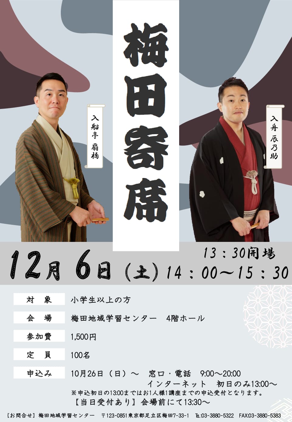 往復ハガキに、講座名、住所、氏名、電話番号、年齢をご記入のうえ、梅田地域学習センターまで〆切日必着にてお送りください。