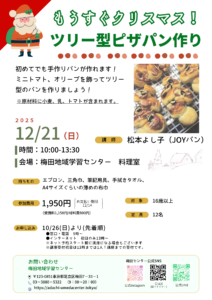 12月212025 もうすぐクリスマス!ツリー型ピザパン作り 初めてでも手作りパンが作れます! ミニトマト、オリーブを飾ってツリー型のパンを作りましょう! ※原材料に小麦、乳、トマトが含まれます。 日時12月21日(日) 午前10時~午後1時半 ※開始5分前までに会場に集合 講師松本よし子(JOYパン) 会場2F 料理室 対象16歳以上 参加費1950円(受講料1,150円・材料費800円) ※12/14までにご入金手続きをお願いします。 定員12名 申込み方法10/26(日)9:00~電話・窓口・インターネットにて受付。インターネットは初日のみ13時~受付開始。 ※講座受付初日は13時までは1人1講座までの受付です。 持ち物エプロン、三角巾、筆記用具、手拭きタオル、 A4サイズぐらいの薄めの布巾