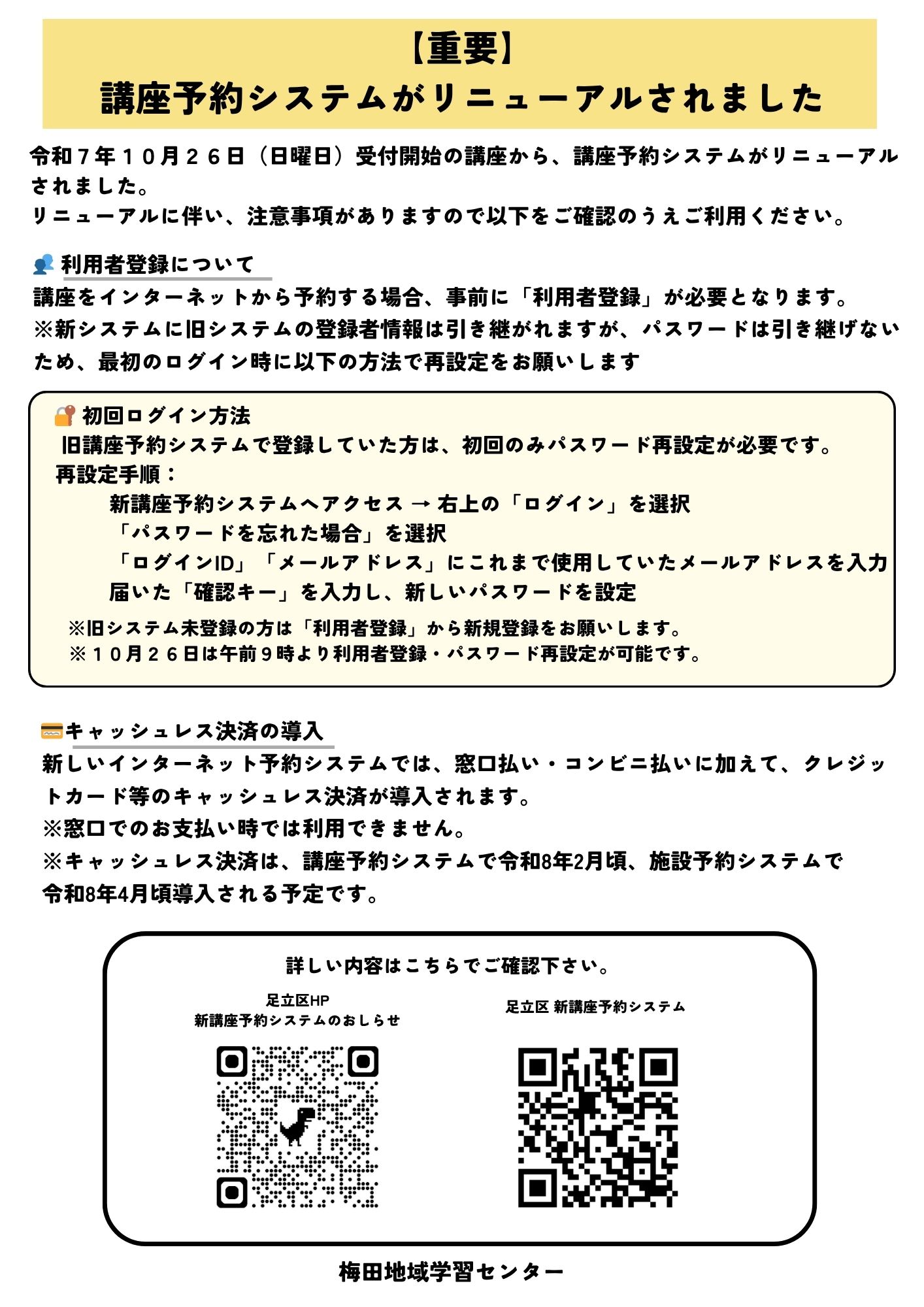 この度足立区講座予約システムがリニューアルされました。令和7年10月26日(日曜日)受付開始の講座から、新システムでの予約受付となります。