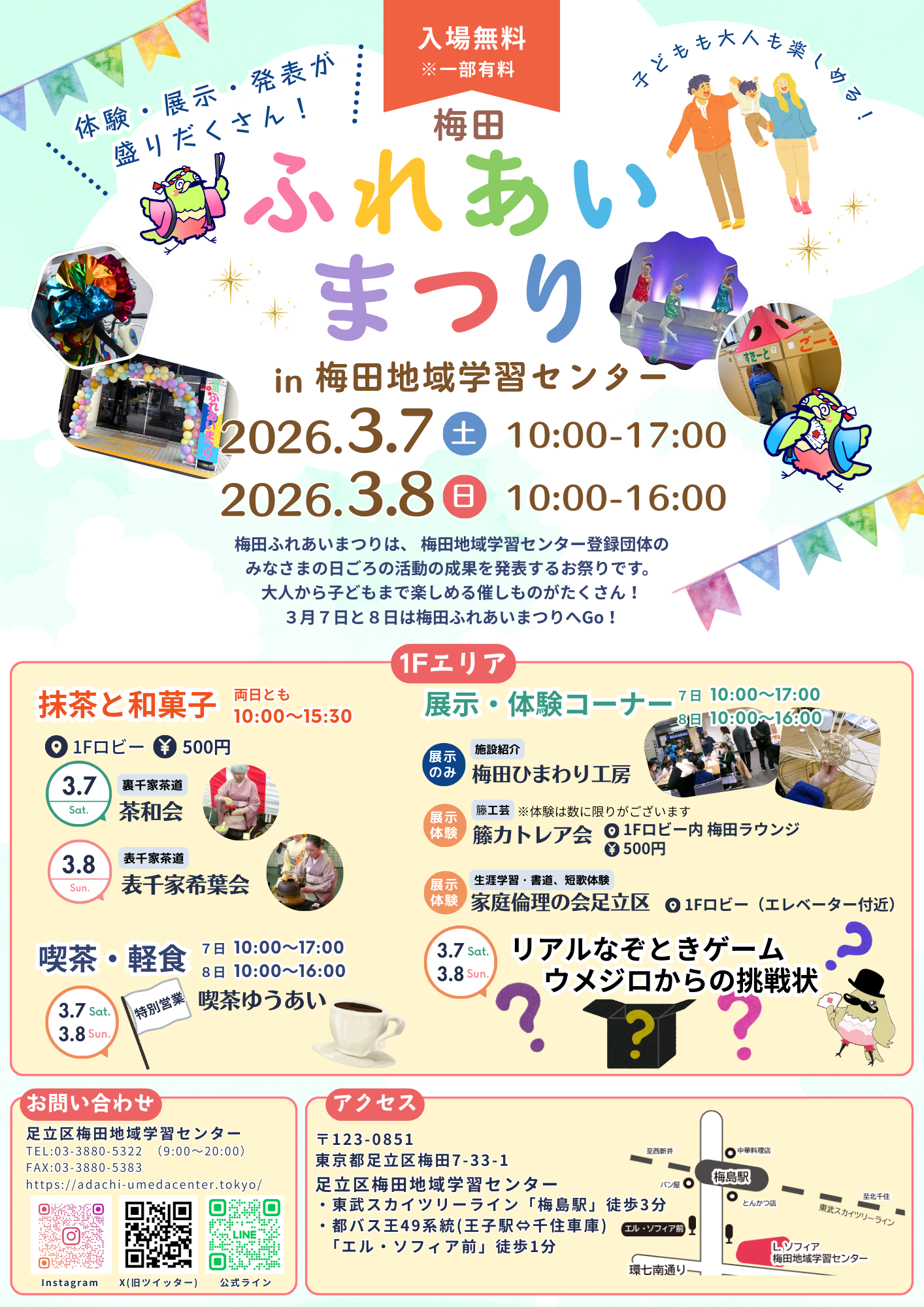 R8年度ふれあいまつり開催します! 3/7(土)、8(日) 2026.02.06 ふれあいまつり in梅田地域学習センター 2026.3.7(土)10:00~17:00 2026.3.8(日)10:00~16:00 梅田ふれあいまつりは、梅田地域学習センター登録団体のみなさまの日ごろの活動の成果を発表するお祭りです。 大人から子供まで楽しめる催しものがたくさん!3.7(土)と、3.8(日)は梅田ふれあいまつりへGO! ※3.7(土)開催の、「ブルーキャット」による一輪車体験は、事前申し込みが必要です。 お申し込みはこちら 詳細はこちら
